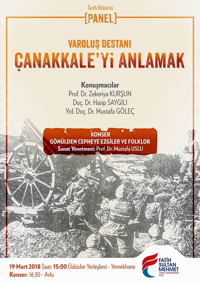Fatih Sultan Mehmet Vakıf Üniversitesi Tarih Bölümü, Çanakkale Deniz Zaferi'nin 103. yıl dönümünde Tarih Bölümü öğretim üyelerinin konuşmacı olduğu "Varoluş Destanı Çanakkale'yi Anlamak" adlı bir panel düzenliyor.