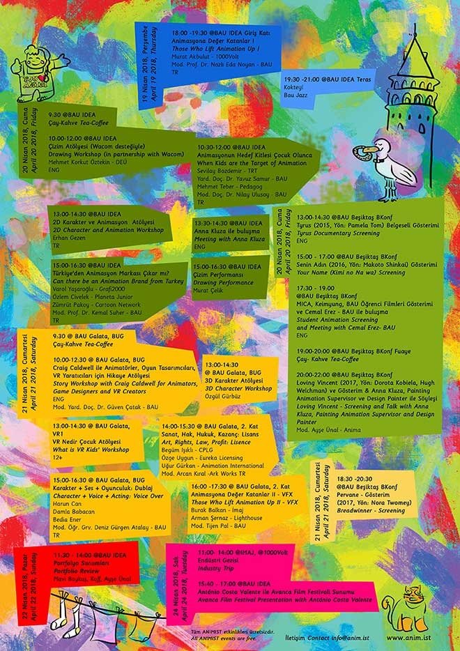 Oscar Adayı animasyon film Loving Vincent'ın baş animatörlerinden Anna Kluza; animasyon VR ve dijital oyun için hikaye yazımında uzmanlaşmış Craig Caldwell; Türkiye'nin ilk tasarım merkezi olan ve animasyona değer katan post prodüksiyon merkezi 1000Volt; VFX'in ustalarından Burak Balkan ve Arman Şernaz; Lisans, Dublaj konularının ve Animasyon alanında dünya markası çıkarır mıyız sorusunun yanıtını arayan paneller; Afgan bir kız çocuğunun var olma mücadelesini dokunaklı şekilde ele alan Oscar adayı Breadwinner ve Japon animelerinin konusu itibariyle de öne çıkan son örneklerinden Senin Adın ile Amerikan'dan MICA ve Güney Kore'den Keimyung Üniversitelerinden öğrenci animasyon filmleri gösterimi; çizim, 3D ve 2D karakter yaratımı ve animasyon atölyeleri; Çocuklar için VR nedir etkinliği ve aileler için Animasyonun Hedef Kitlesi Çocuk Olunca paneli, Ustalarla portfolyo inceleme ve İstanbul animasyon sektörü öncülerine gezi…