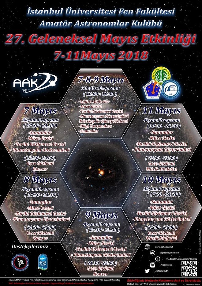 İstanbul Üniversitesi amatör Astronomlar Kulübü tarafından her yıl düzenli olarak gerçekleştirilen ve Türkiye’nin geleneksel hale gelmiş en eski astronomi şenliği olan “Mayıs Etkinliği”, bu yıl 7-11 Mayıs 2018 tarihleri arasında İÜ Fen Fakültesi Astronomi ve Uzay Bilimleri Bölümü çatısı altında gerçekleştiriliyor.