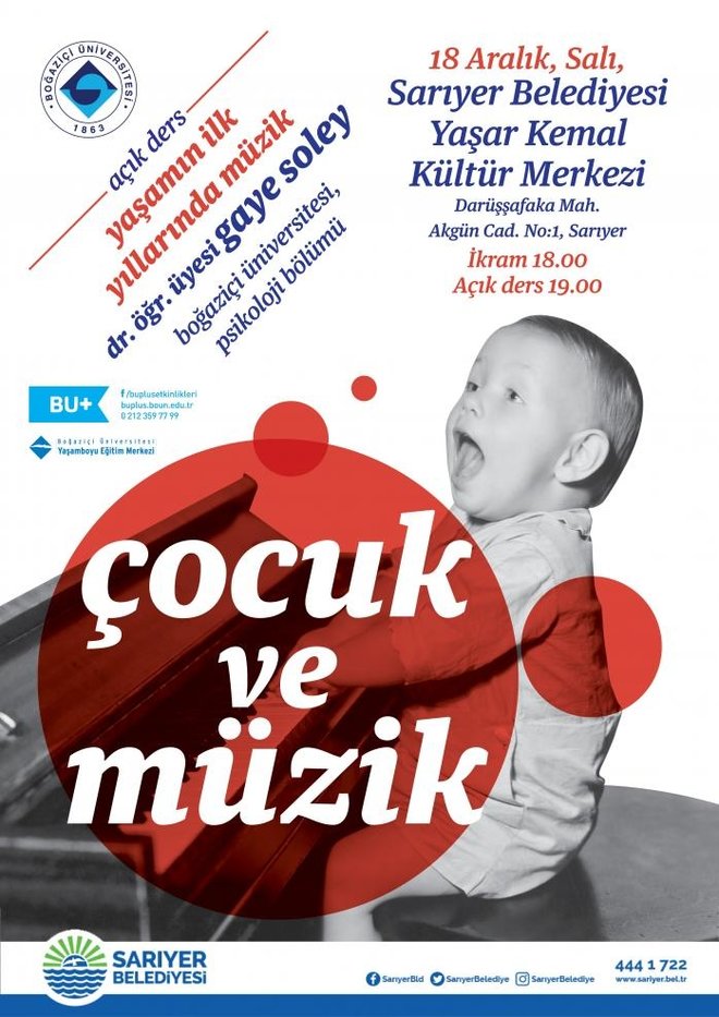 BU+ Etkinlikleri kapsamında düzenlenen, Dr. Öğr. Üyesi Gaye Soley'in vereceği ''Çocuk ve Müzik'' başlıklı Açık Ders, 18 Aralık'ta Yaşar Kemal Kültür Merkezi'nde. Etkinlik dizisi Sarıyer Belediyesi ve BÜYEM'in destekleriyle gerçekleştiriliyor.