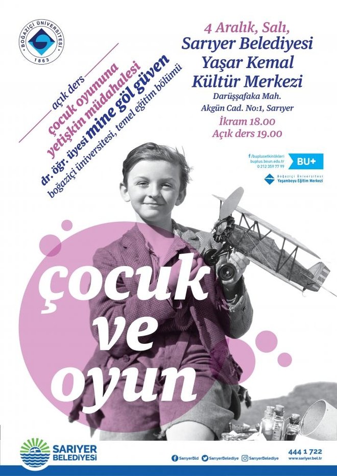 BU+ Etkinlikleri kapsamında düzenlenen, Dr. Öğr. Üyesi Mine Göl Güven'in vereceği ''Çocuk ve Oyun'' başlıklı Açık Ders, 4 Aralık'ta Yaşar Kemal Kültür Merkezi'nde. Etkinlik dizisi Sarıyer Belediyesi ve BÜYEM'in destekleriyle gerçekleştiriliyor.