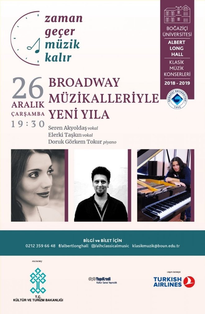 Boğaziçi Üniversitesi'nin dünyaca ünlü sanatçı ve topluluklarını ağırlayan, gelenekselleşen Albert Long Hall Klasik Müzik Konserleri yeni yıl yaklaşırken Broadway müzikalleriyle coşkulu bir kutlamaya hazırlanıyor. 26 Aralık tarihindeki konserin solistleri Seren Akyoldaş (Vokal), Elerki Taşkın (Vokal) ve Doruk Görkem Tokur (Piyano).