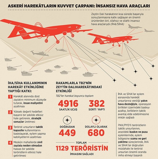 Zeytin Dalı harekatının kısa sürede başarıyla sonuçlanmasına katkı sağlayan en önemli ürünlerden biri, silahsız ve silahlı insansız hava araçlarıydı (İHA/SİHA).