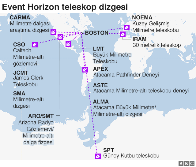 Dünya'dan 500 bin katrilyon (500 kentilyon) km uzaktaki kara deliğin fotoğrafını çekmek için dünyanın farklı bölgelerinde yer alan 8 teleskop kullanıldı.