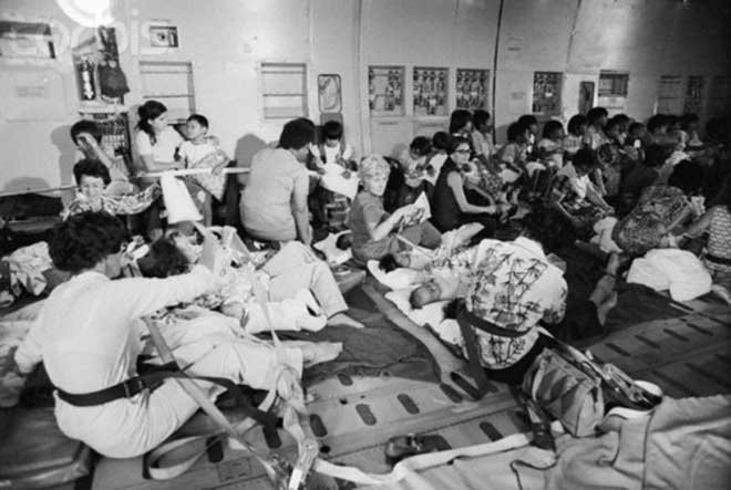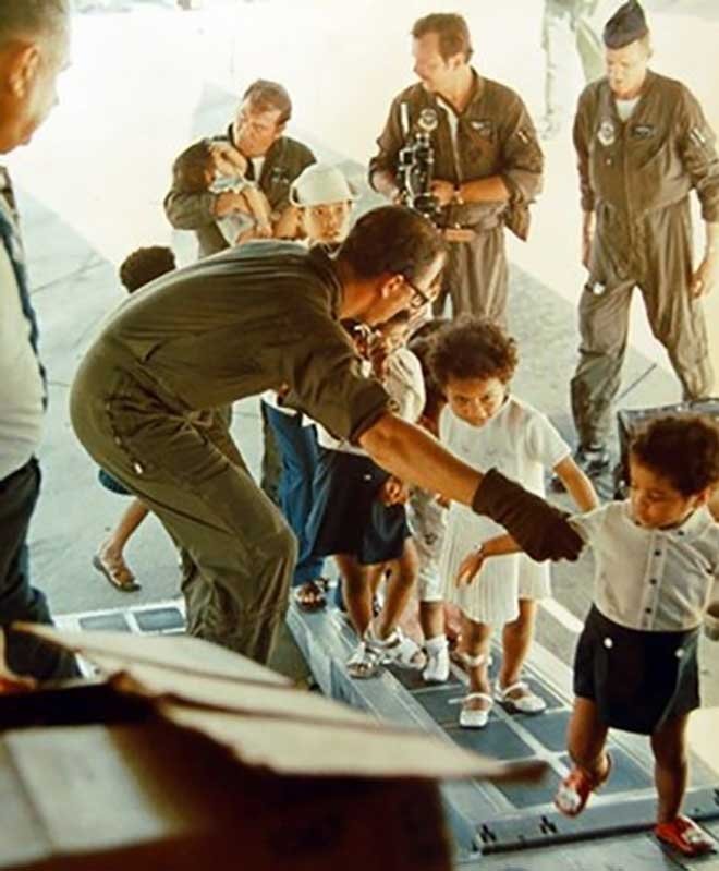 Savaş öncesi Güney Vietnam'ın başkenti olan Saigon'da (bugünkü adıyla Ho Chi Minh), 3 bini aşkın yetim çocuk, başka aileler tarafından evlat edinilmek üzere, uçaklara bindiriliyor.