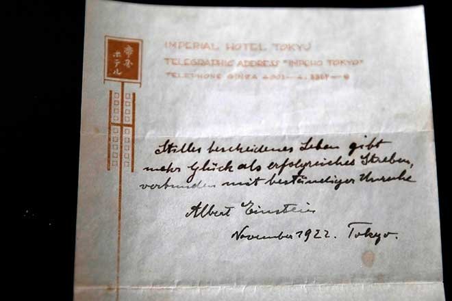 Einstein'ın 1922'de Japonya'da bir kuryeye bahşiş yerine verdiği iki not, Kudüs'te yapılan açık artırmada satışa sunuldu.