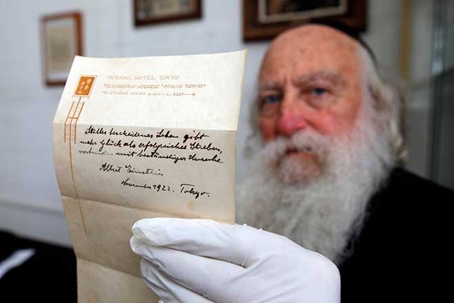 Fizik dehası Albert Einstein'ın 1922'de Japonya'da bir kuryeye bahşiş yerine verdiği, mutluluğu tarif eden not, Kudüs'te yapılan açık artırmada 1,56 milyon dolara (yaklaşık 5,82 milyon lira) satıldı.