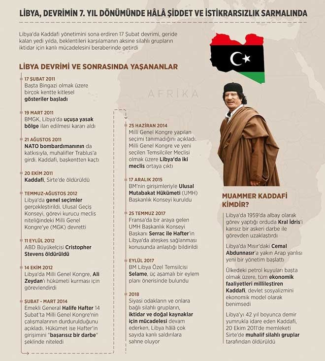 Libya'da Kaddafi rejimini sona erdiren 17 Şubat devrimi, geride kalan yedi yılda, beklentileri karşılamanın aksine silahlı grupların iktidar için kanlı mücadelesini beraberinde getirdi.