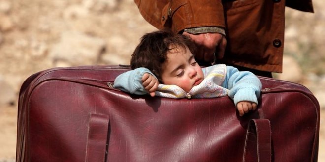 Tahliye sırasında zor şartlarda bir baba çocuğunu bavul içinde taşımak zorunda kaldı.
