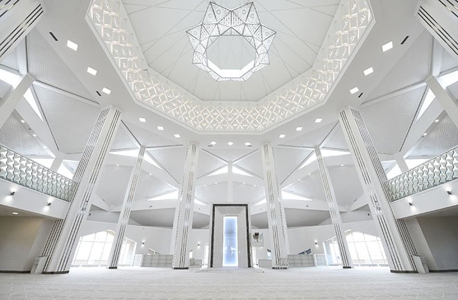 Kazak mitolojisindeki "kutsal tüy" şeklinde yapılan caminin tek minaresinin yüksekliği 43 metre.