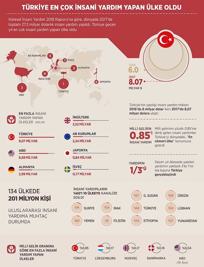 Küresel İnsani Yardım 2018 Raporu'na göre, Türkiye geçen yıl en çok insani yardım yapan ülke oldu. Milli gelirinin yüzde 0,85'ine denk gelen insani yardımlar, Türkiye'yi dünyadaki, "en cömert ülke" konumuna getirdi. Dünyada geçen yıl yapılan toplam insani yardım 27,3 milyar doları bulurken, bunun yaklaşık üçte birini Türkiye tek başına sağladı.