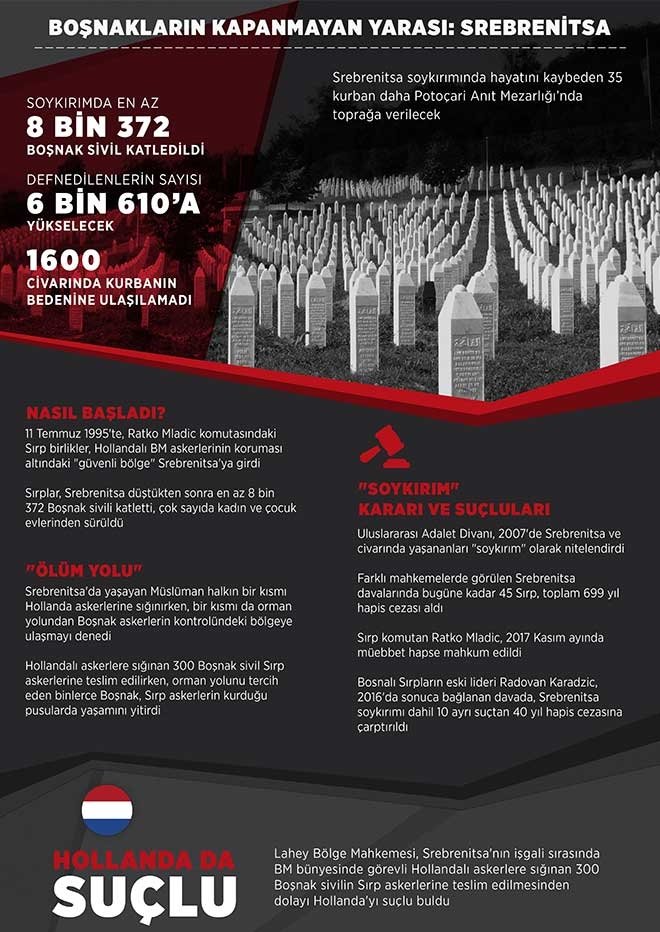 En az 8 bin 372 Boşnak sivilin Sırp askerlerce hunharca katledildiği Srebrenitsa soykırımı, aradan 23 yıl geçmesine rağmen Boşnak halkı için kapanmayan bir yara olmaya devam ediyor. Soykırımın yıl dönümü 11 Temmuz'da, kimlik tespitleri tamamlanan 35 yeni kurbanın defnedileceği Potoçari Anıt Mezarlığı'nda 6 bin 575 kurbanın mezarı bulunuyor. Farklı mahkemelerde görülen Srebrenitsa davalarında bugüne kadar 45 Sırp, toplam 699 yıl hapis cezası aldı.
