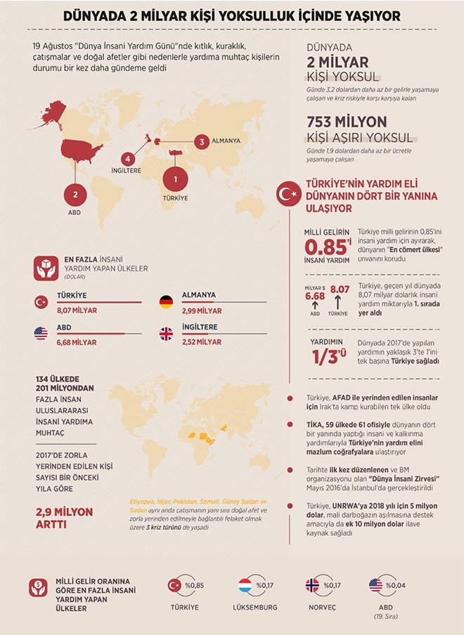 "Küresel İnsani Yardım Raporu 2018" verilerine göre, dünyada 2 milyar kişi yoksulluk, 753 milyon kişi de aşırı yoksulluk içinde yaşamını sürdürmeye çalışıyor. Geçen yıl dünyadaki çatışmalar ve felaketler nedeniyle hayatta kalabilmek için son çare olarak uluslararası yardıma muhtaç duruma düşen kişi sayısı 201 milyonu geçti.