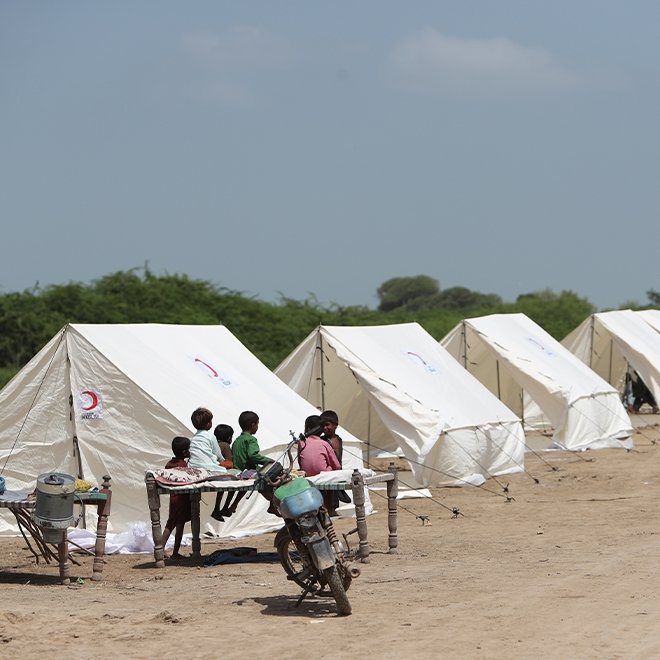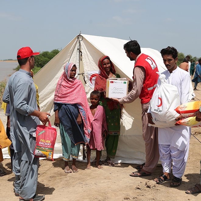 Pakistan Kızılayı iş birliği ile gıda kolisi, hijyen kiti, yatak, battaniye, su bidonu, giysi, ikramlık ve oyuncak yardımlarını sürdüren Kızılay, sel bölgelerine sevk ettiği 500 adet 12 metrekare afet çadırının kurulumuna bir taraftan devam ederken diğer taraftan kurulumu tamamlanan çadırlara selden etkilenen insanları yerleştirmeye başladı.
