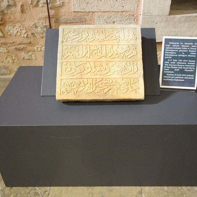 Kültür ve Turizm Bakanlığından alınan bilgiye göre, Marmara Üniversitesi Öğretim Üyesi Prof. Dr. Neval Konuk Halaçoğlu'nun ihbarı üzerine, eylül 2021'de Hollanda'daki bir müzayede evinde bir cami kitabesinin satışa çıkarılacağı Bakanlık tarafından tespit edildi.