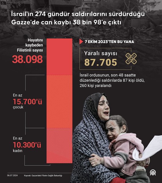 İsrail'in 7 Ekim 2023'ten bu yana Gazze Şeridi'ne düzenlediği saldırılarda ölenlerin sayısının 38 bin 98'e, yaralananların sayısının da 87 bin 705'a yükseldiği kaydedildi.