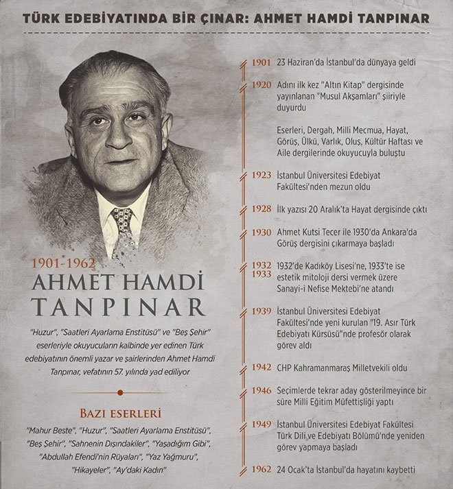 "Huzur", "Saatleri Ayarlama Enstitüsü" ve "Beş Şehir" eserleriyle okuyucuların kalbinde yer edinen Türk edebiyatının önemli yazar ve şairlerinden Ahmet Hamdi Tanpınar, vefatının 57. yılında yad ediliyor.