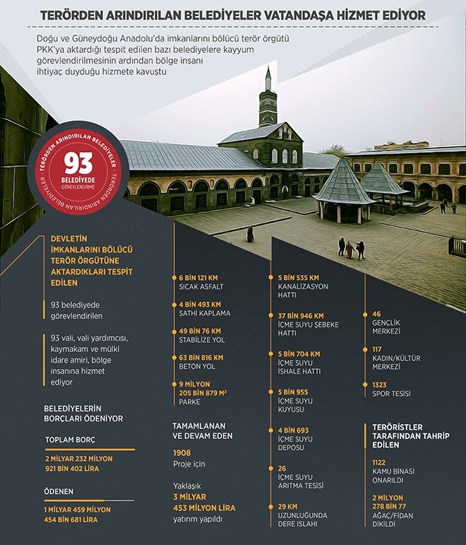 Devletin imkanlarını bölücü terör örgütüne aktardıkları tespit edilen 93 belediyede görevlendirilen 93 vali, vali yardımcısı, kaymakam ve mülki idare amiri, bölge insanına hizmet ediyor.