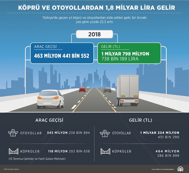 İstanbul'daki 15 Temmuz Şehitler ve Fatih Sultan Mehmet köprülerini geçen yıl kullanan 118 milyon 202 bin 658 araç için 464 milyon 286 bin 899 lira ücret alındı. Aynı dönemde otoyollardan yararlanan 345 milyon 238 bin 894 taşıttan da 1 milyar 334 milyon 451 bin 290 lira gelir elde edildi.