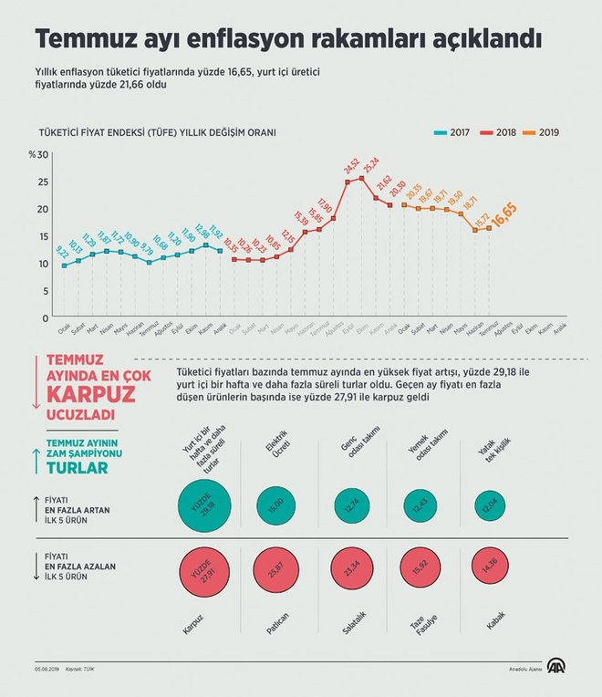 Türkiye İstatistik Kurumu verilerine göre temmuz ayında Tüketici Fiyatları Endeksi (TÜFE), bir önceki aya göre yüzde 1,36 ve bir önceki yılın aynı ayına göre yüzde 16,65 arttı.