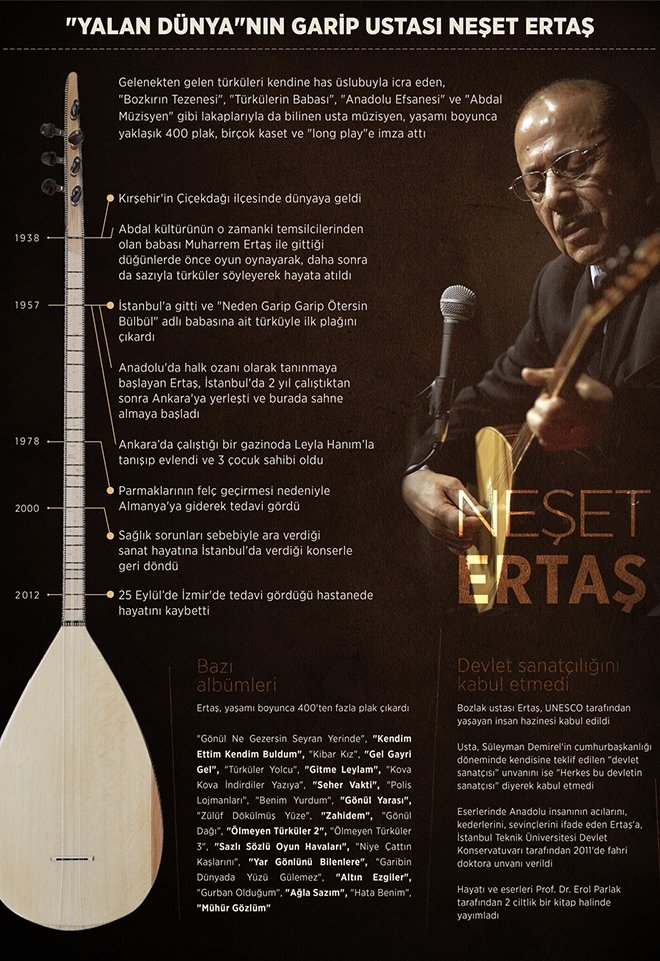 "Bozkırın Tezenesi" olarak ünlenen Türk Halk Müziği'nin efsane ismi, saz ve söz ustası Neşet Ertaş, 1938'de Kırşehir'in Çiçekdağı ilçesinde dünyaya geldi.