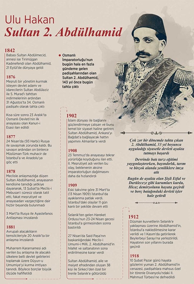 Bundan tam 143 yıl önce bugün Sultan II. Abdülhamid, Osmanlı İmparatorluğu’nun 34’üncü padişahı ve 113’üncü İslam halifesi olarak tahta çıktı. Amcası Abdülaziz’in şüpheli ölümüne ve ağabeyi V. Murad’ın azline tanık olmuş; o zamana kadar tahta geçeceğini asla düşünmemişti. 33 yıllık hükümdarlığı boyunca Osmanlı topraklarına birçok hizmette bulunmuş, devlet ve hilafet mührünü abdestsiz basmayacak kadar dindar bir yaşam sürmüştü.
