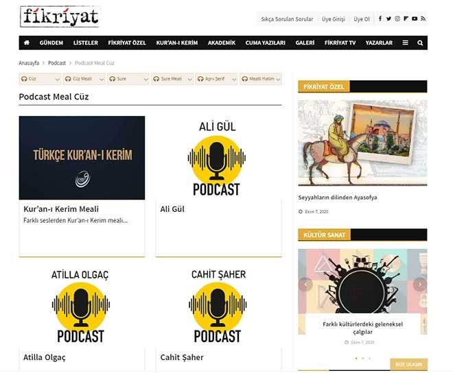 Fikriyat.com, son dijital yenilikleri içerisinde "Kur'an-ı Kerim cüz meali" podcast kayıtlarına alanında özel 8 sesi sizlerle buluşturuyor. Cahit Şaher, Mehmet Atay, Sinan Divrik, Mesut Uz, Tarkan Koç, Köksal Engür, Sungun Babacan ve Atilla Olgaç da meal okumaları ile sizlerle olacak.