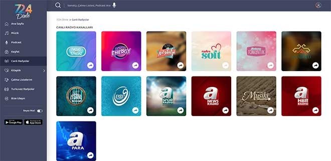➡ 7/24 Dinle ile günün 24 saati; Radyo Turkuvaz, Turkuvaz Romantik, Turkuvaz Efsane, Vav Radyo, A Spor Radyo, A News Radio, Musiki, Turkuvaz Nostalji, Anadolu, Radyo Energy, Radyo Soft, A Haber Radyo, A Para Radyo gibi 13 farklı radyoyu canlı olarak dinleyebilirsiniz.