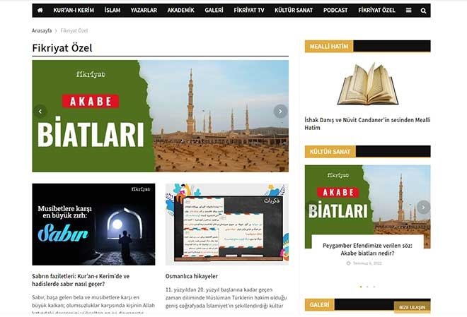 İslam'a dair hayata dokunan en doğru ve güvenilir ilmihal bilgileri, fikir hayatına yön veren yazı, özel dosya ve videolarıyla dijital medyada ayrıcalıklı bir yer edinen fikir ve düşüncenin referans sitesi Fikriyat.com, Osmanlıca dersleri gibi medeniyetimize dair eğitici ve öğretici yayınlarıyla, okurlarına zenginlik katan ayrıcalıklar sunuyor.