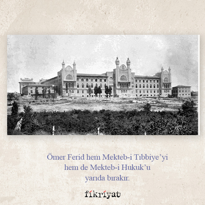 ◼ Ömer Ferit, babasının isteği üzerine Mekteb-i Tıbbiye-yi Mülkiye'ye yazılır. Fakat Ömer Ferit burada geçirdiği zaman içinde bu mesleği icra ederken mutluluk duymayacağının farkına varır. Ardından Tıbbiye'yi yarıda bırakarak Mekteb-i Hukuk'a girer. Ancak babasının ölümüyle buradan da ayrılmak zorunda kalır.