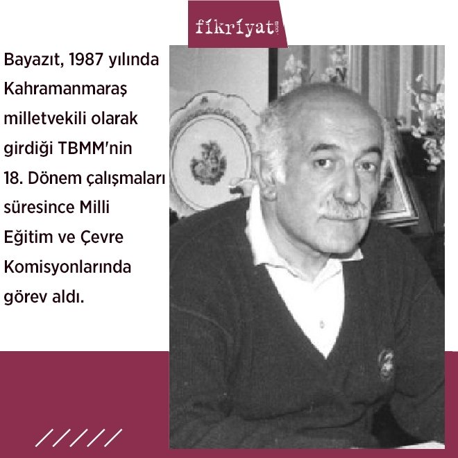 ◾ Akabe Yayınları'nın İstanbul'a taşınması kararı ile 1984'te yeniden memurluğa dönen şair, bir süre Devlet Planlama Teşkilatı'nda çalıştı. Bayazıt, ayrıca 1987 yılında Kahramanmaraş milletvekili olarak girdiği TBMM'nin 18. Dönem çalışmaları süresince Milli Eğitim ve Çevre Komisyonlarında görev aldı.