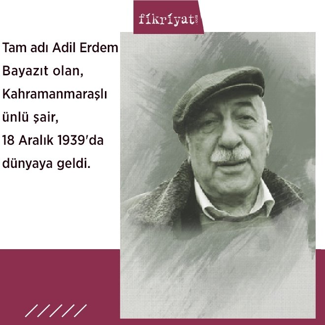 ◾ Tam adı Adil Erdem Bayazıt olan, Kahramanmaraşlı ünlü şair, 18 Aralık 1939'da dünyaya geldi. Maliye'de memur olan babası Ökkeş Tahsin Bey'in aile kökleri, Yavuz Sultan Selim'in Çaldıran Seferi dönüşünde Doğubayazıt'tan getirerek Maraş'ta iskân ettiği Bayazıtlılara dayanır.
