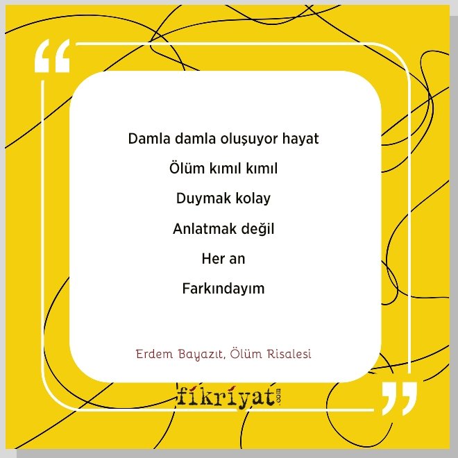 ◾ İstanbul'a yerleşen Bayazıt, akciğer kanseri sebebiyle 69 yaşındayken 5 Temmuz 2008'de İstanbul'da vefat etti. Edebiyatımızın unutulmaz şiirlerini kaleme alan Erdem Bayazıt'ı sevgi saygı ve rahmetle anıyoruz.