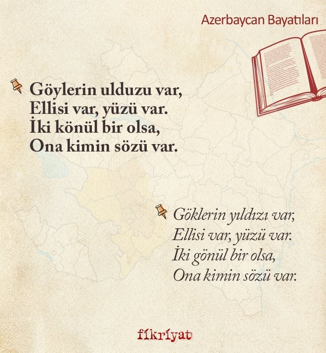 "Bu içerikte Türk Dil Kurumu Yayınlarından çıkan "Azerbaycan Bayatıları" kitabından yararlanılmıştır.