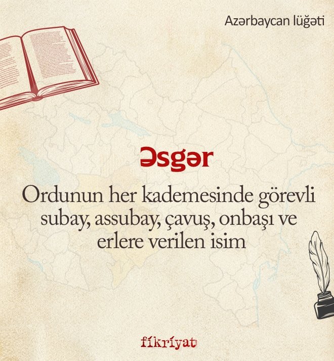 ➡ Arapça kökenli "asker" kelimesi, "ordunun her kademesinde görevli subay, astsubay, çavuş, onbaşı ve erlere verilen isim" anlamlarına gelir. Azerbaycanlı Barat Vüsal 'ın "Əsgərə Məktub" şiiri ise bu bu sözcüğer bir örnektir.