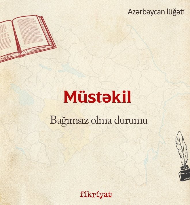 ➡ Türkiye Türkçesi'nde olduğu gibi Azerabaycan Türkçesi'nde de "bağımsızlık" anlamına gelen birçok kelime bulunur. Bunlardan biri de "Müstəkil" sözcüğüdür. Arapça kökenli olan bu kelime, "bağımsız olmak" anlamına gelir. Bu terime en güzel örnek Elmin Nurlu'nun "Türk oğlu Türkəm!" adlı şiiridir.
