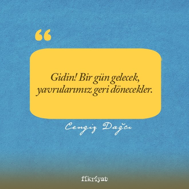 🔹 "Bu toprağın... Dedelerimin kemikleri üstüne benim de kanım aksın. Gidin! Bir gün gelecek, yavrularımız geri dönecekler. Şimdi ayaklarımın, dizlerimin olduğu yerde benim bu izlerim silinecek, gelincik çiçekleri açacak. Benim kanım, kemiklerim üstünde de gelincikler açacak. Gidin! Bilin ki yavrularımız bir gün geri dönecekler, gelinciklere bakıp bizi hatırlayacaklar. Bu toprağın, bu yurdun kıymetini bizden daha iyi bilecek, onu bizden daha çok sevecekler..."