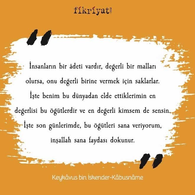 İnsanların bir âdeti vardır, değerli bir malları olursa, onu değerli birine vermek için saklarlar. İşte benim bu dünyadan elde ettiklerimin en değerlisi bu öğütlerdir ve en değerli kimsem de sensin. İşte son günlerimde, bu öğütleri sana veriyorum, inşallah sana faydası dokunur.