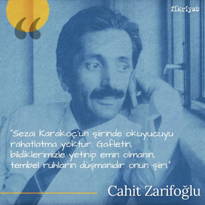 "Sezai Karakoç'un şiirinde okuyucuyu rahatlatma yoktur. Gafletin, bildiklerimizle yetinip emin olmanın, tembel ruhların düşmanıdır onun şiiri. Okuyucusunu durmadan sarsmakta, bir kelam-ı kibardaki: "yürü… yüksel… zira tam yerini buluncaya kadar, her halin hayâldir." hikmetini anlatmaktadır."