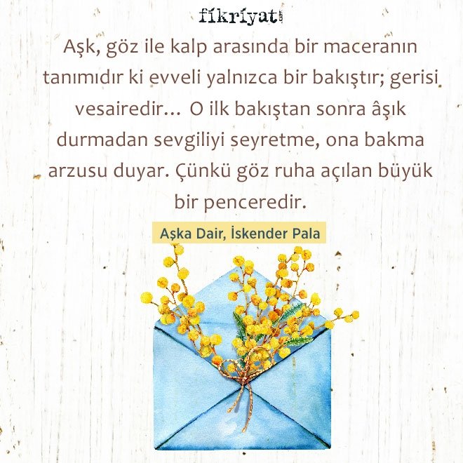 Aşk, göz ile kalp arasında bir maceranın tanımıdır ki evveli yalnızca bir bakıştır; gerisi vesairedir… O ilk bakıştan sonra âşık durmadan sevgiliyi seyretme, ona bakma arzusu duyar. Çünkü göz ruha açılan büyük bir penceredir.