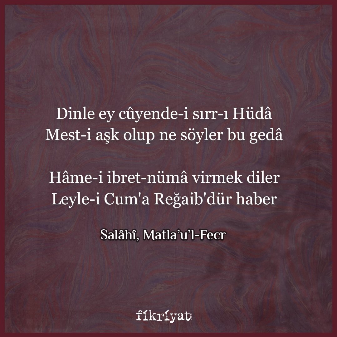 🔸 Ey ilahi sırları bilmek isteyen! Aşk sarhoşu olan bu fakirin söylediklerine kulak ver. Onun ibret habercisi olan kalemi, Regaib gecesinin, Cuma gecesine rastladığını haber vermektedir.