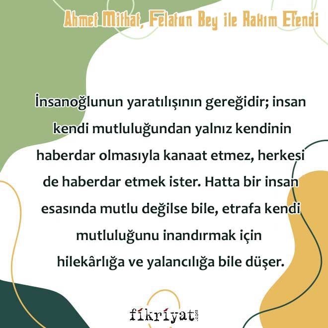 İnsanoğlunun yaratılışının gereğidir; insan kendi mutluluğundan yalnız kendinin haberdar olmasıyla kanaat etmez, herkesi de haberdar etmek ister. Hatta bir insan esasında mutlu değilse bile, etrafa kendi mutluluğunu inandırmak için hilekârlığa ve yalancılığa bile düşer.