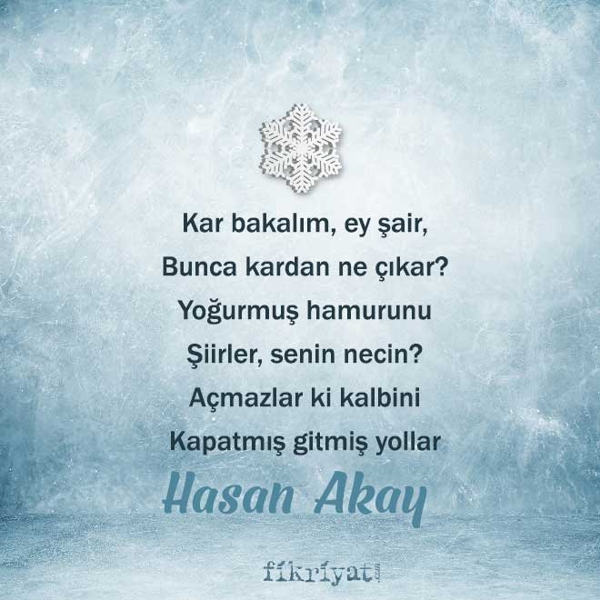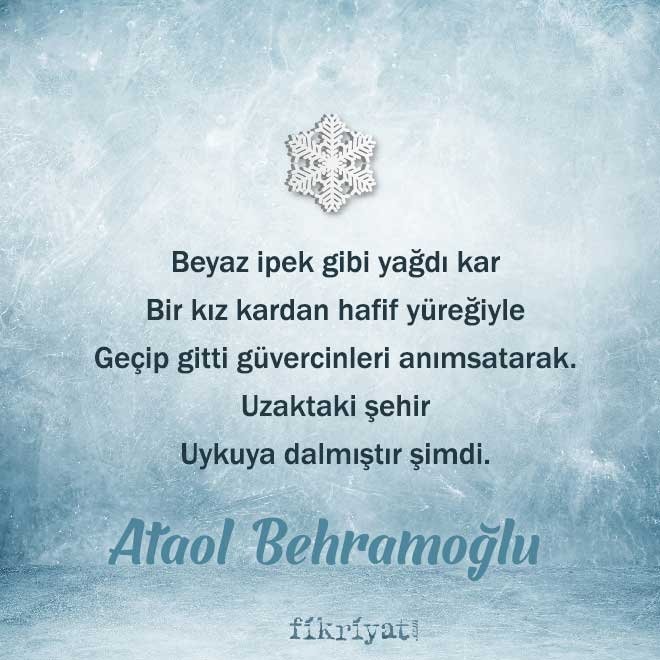 Dört gözle beklediğimiz kar, yurdu etkisi altına almaya başladı. Gökyüzünden yere inen bu beyaz mucize, insanların kalbini huzurla kaplar. Doğanın armağanıdır aynı zamanda. Her bir tanesinde ayrı gizemi barındırır. Nitekim, birçok yazar ve şair doğanın bu eşsiz şöleninden ilham alarak eserlere imza attı. Cahit Sıtkı Tarancı karı,"Yağan beyaz sükut, bir mahşer" olarak tanımlar. Sizler için edebiyatımızın usta kalemlerinden kar şiirlerini derledik.