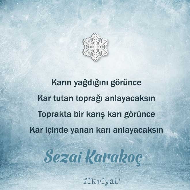 Dört gözle beklediğimiz kar, yurdu etkisi altına almaya başladı. Gökyüzünden yere inen bu beyaz mucize, insanların kalbini huzurla kaplar. Doğanın armağanıdır aynı zamanda. Her bir tanesinde ayrı gizemi barındırır. Nitekim, birçok yazar ve şair doğanın bu eşsiz şöleninden ilham alarak eserlere imza attı. Cahit Sıtkı Tarancı karı,"Yağan beyaz sükut, bir mahşer" olarak tanımlar. Sizler için edebiyatımızın usta kalemlerinden kar şiirlerini derledik.