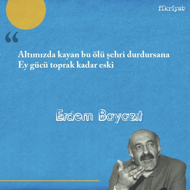 Yedi Güzel Adam'ın sessiz ismi Erdem Bayazıt 1956 yılında başladığı edebi serüvenini vefat edene kadar büyük bir özveri ile sürdürdü. Erdem Bayazıt şiiri metafizik ve toplumsal temellere yaslanır. Erdem Bayazıt şiirleri ve sözlerini bir süzgeçten geçirerek okuyucusu ile buluşturur. Erdem Bayazıt eserleri ile çağlar ötesine seslenen bir bilge olduğu gibi şiirde bir dönem boyunca önemli tesirler uyandırır. Sizler için Erdem Bayazıt'ın şiirlerini, en güzel sözlerini ve eserlerinden alınan mısraları bir araya getirdik.