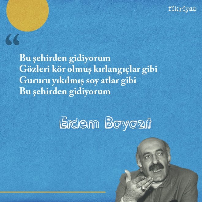 Yedi Güzel Adam'ın sessiz ismi Erdem Bayazıt 1956 yılında başladığı edebi serüvenini vefat edene kadar büyük bir özveri ile sürdürdü. Erdem Bayazıt şiiri metafizik ve toplumsal temellere yaslanır. Erdem Bayazıt şiirleri ve sözlerini bir süzgeçten geçirerek okuyucusu ile buluşturur. Erdem Bayazıt eserleri ile çağlar ötesine seslenen bir bilge olduğu gibi şiirde bir dönem boyunca önemli tesirler uyandırır. Sizler için Erdem Bayazıt'ın şiirlerini, en güzel sözlerini ve eserlerinden alınan mısraları bir araya getirdik.