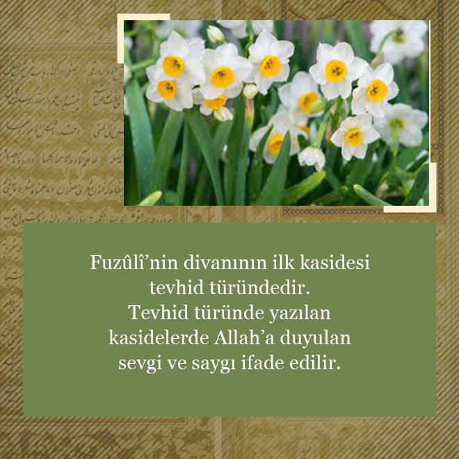 ◾ Fuzûlî'nin divanının ilk kasidesi tevhid türündedir. Tevhid türünde yazılan kasidelerde Allah'a (CC) duyulan sevgi ve saygı ifade edilir. Fuzûlî bu beyitleriyle insanları eşyaya tapmakta alıkoymak istemiş, Yaratan'a iman etmek yerine yaratılanlara tapan insanları uyarmıştır.