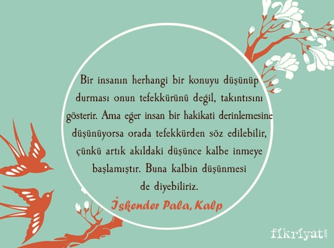Kültürümüzün irfan geleneğine odaklanan İskender Pala "Kalbimizde iyiliğin de kötülüğün de tohumu mevcuttur, hangisini yeşerteceğine insan karar verir." diyerek Kalp adlı kitabında onu bütün yönleriyle ele alır. Aklı ön plana çıkarıp, kalbe olan ihtiyacı unutan modern zaman insanına bir hatırlatmada bulunur adeta. Sizler için, İskender Pala'nın Kalp adlı kitabından alıntıları derledik.
