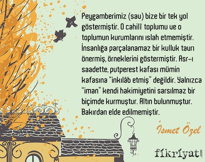 "Peygamberimiz (sav) bize bir tek yol göstermiştir. O cahilî toplumu ve o toplumun kurumlarını ıslah etmemiştir. İnsanlığa parçalanamaz bir kulluk tavrı önermiş, örneklerini göstermiştir. Asr-ı saadette, putperest kafası mümin kafasına "inkılâb etmiş" değildir. Yalnızca "iman" kendi hakimiyetini sarsılmaz bir biçimde kurmuştur. Altın bulunmuştur. Bakırdan elde edilmemiştir."