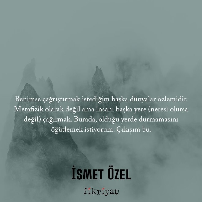 ◼ İsmet Özel'in uğruna ölmeyi, örselenmeyi ve kınanmayı göze aldığı yegane varlık Türkiye idi. Şair tüm düzensiz sistemler karşısında memleketinin sesi oldu.